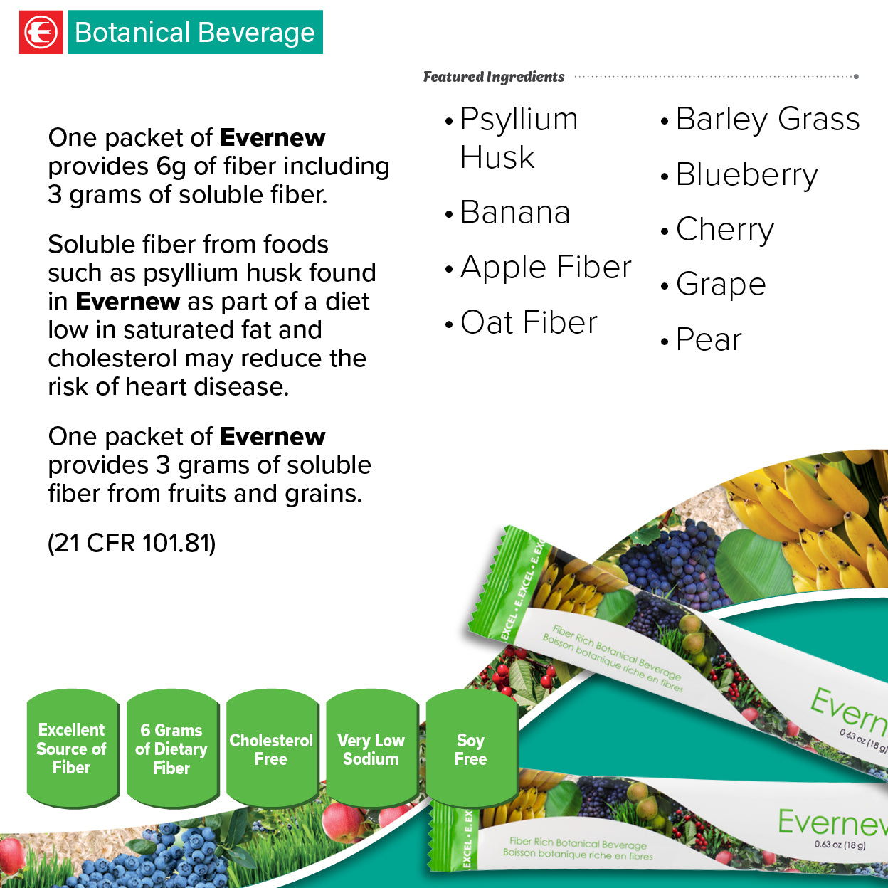 One packet of Evernew® provides 3g of soluble fiber from fruits and grains.